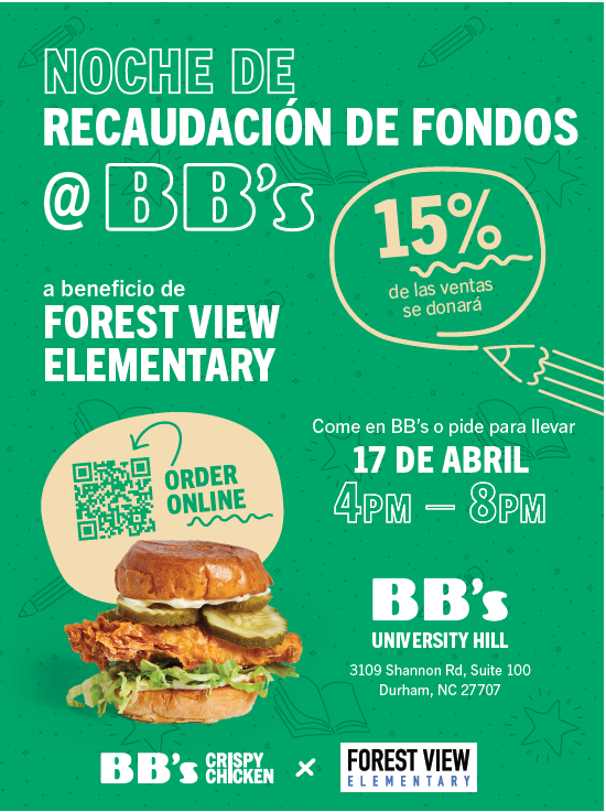 ¡Reserva la fecha para la próxima noche del espíritu! Miércoles, 17 de abril. Cena en el lugar o recoge entre las 4pm y las 8pm. El 15% de todas las ganancias se destinará a Forest View BB’s Chicken, Durham.✨